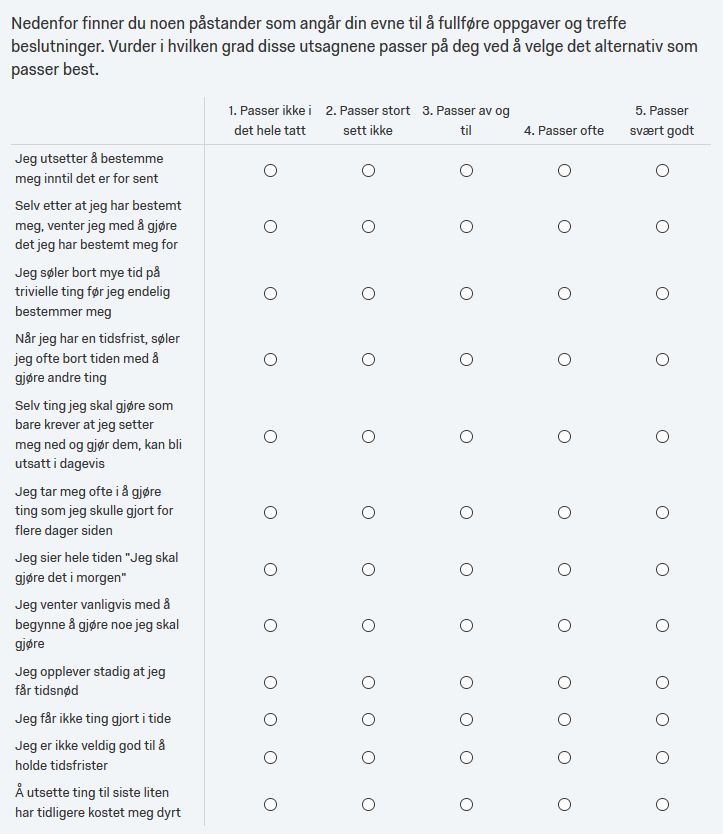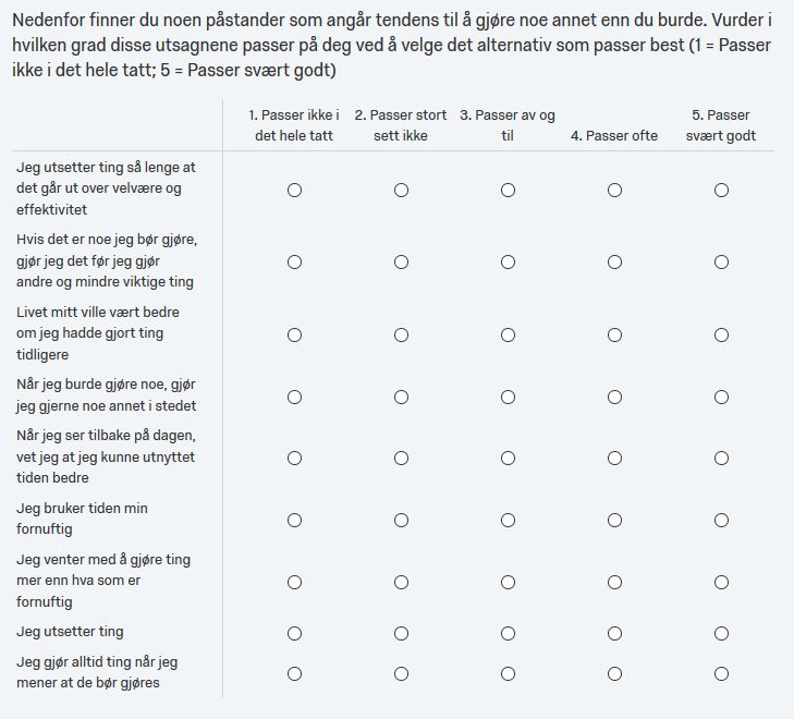 Svartdal, F., Pfuhl, G., Nordby, K., Foschi, G., Klingsieck, K., Rozental, A., Carlbring, P., Lindblom-Ylanne, S., & Rebkowska, K. (2016). On the measurement of procrastination: Comparing two scales in six European countries. Frontiers in Psychology.
